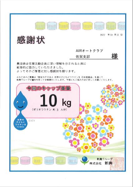 佐賀支部では通年でエコキャップの回収を行っています。上期回収分10㎏を「認定NPO法人 世界の子どもにワクチンを 日本委員会」を通じて寄付しました。下期も引き続き社会貢献活動の一環として、回収活動を継続していきます。