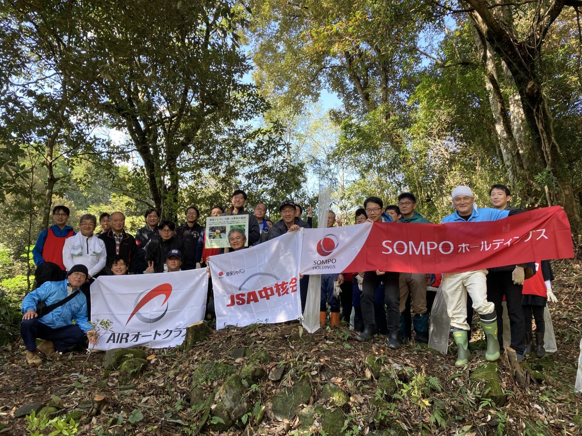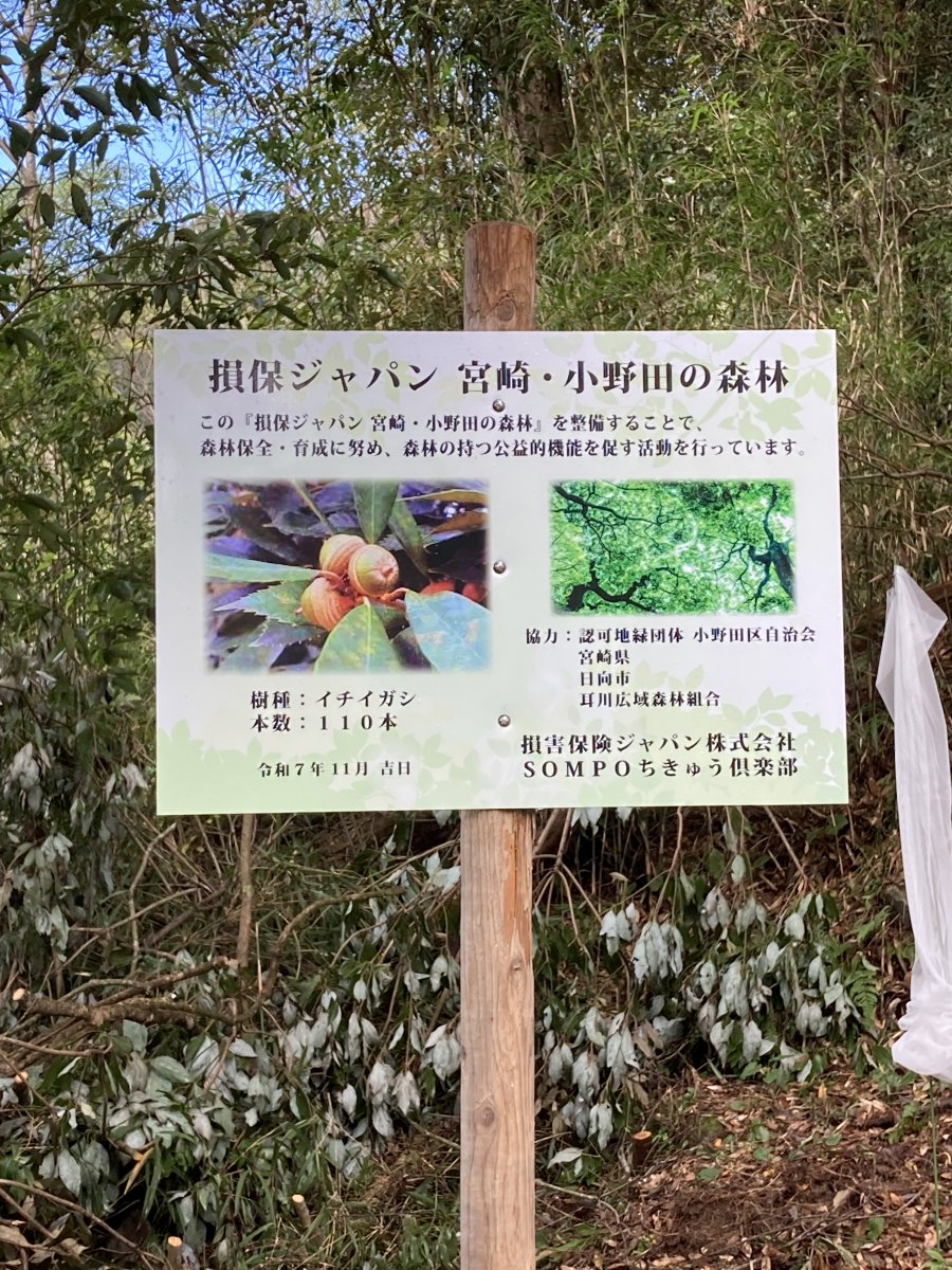 場所は宮崎県日向市東郷町山陰(やまげ)小野田区の山林で、2021年度から日向市、小野田区、SOMPOちきゅう倶楽部、損保ジャパン他で10年間の協定を結び、今年度で5回目の植樹活動となります。