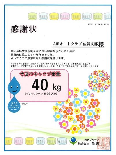 佐賀支部では通年でペットボトルキャップの回収を行っています。2025年度は40kgを㈱新興さまを通じ、国際支援団体の「認定NPO法人世界のこどもにワクチンを日本委員会」へ寄付しました。
