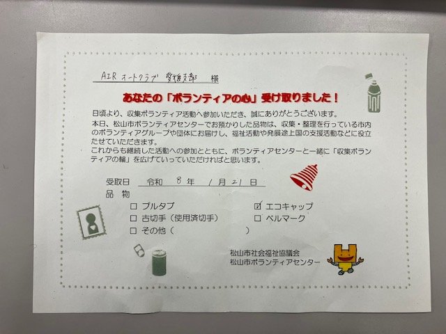 ビニール袋(45L)3袋と段ボール2箱のエコキャップが集まり、『松山市社会福祉協議会 松山市ボランティアセンター』に提出しました。