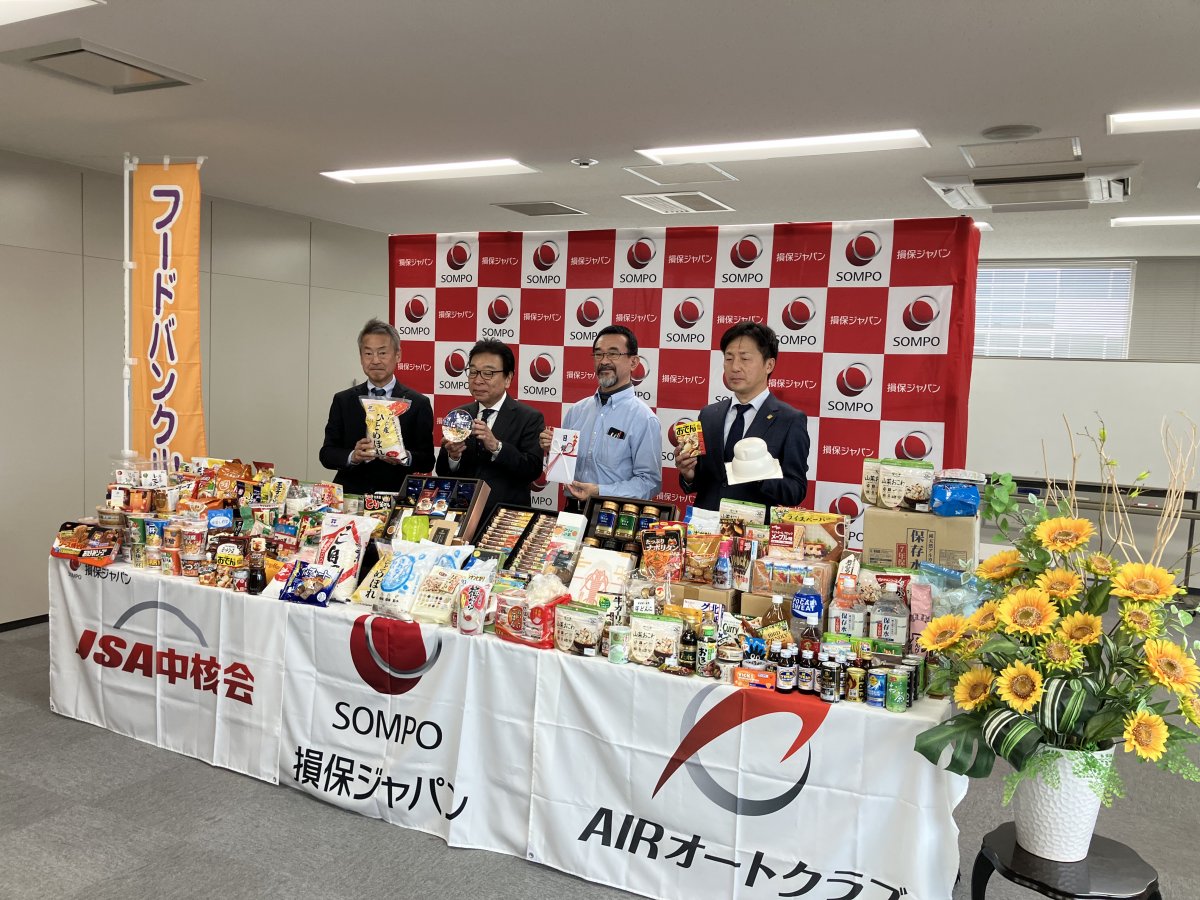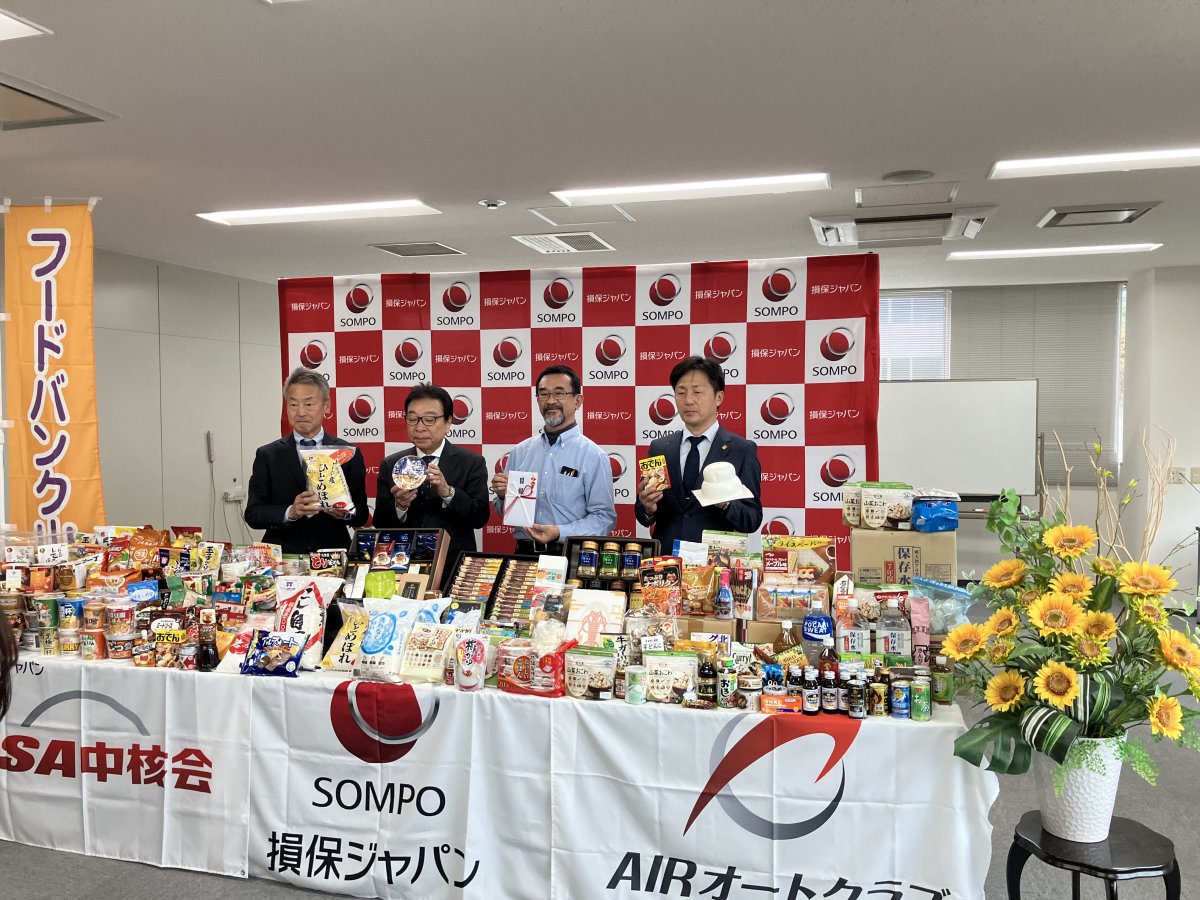 【山口】AIRオートクラブ山口支部(岡部憲治支部長)は、損害保険ジャパン山口支店(仁平直支店長)、JSA中核会山口支部(倉床潤一郎支部長)と協働で、各家庭の贈答品や買いすぎなどで食べない食品をフードバンク山口(今村主税理事長)に寄贈し、損保ジャパン山口支店(山口市)で寄贈式を行った。寄贈した食品は、フードバンク山口の各拠点で配布される。