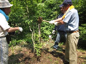 当日は総勢62名が晴天の下、さわやかな汗を流しながら1年で生い茂った下草を丁寧に刈り取りました。その後、約3メートルのブナの苗木3本を立派に成長するようにと願いを込めて植樹しました。