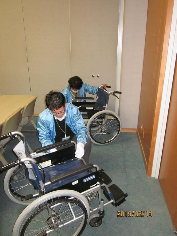 活動内容:大阪城での車椅子活動!お城に車椅子が??という方が大半だと思うのですが、3台の車椅子が設置され、足腰の弱い方、高齢者の方が安心して見学できるように設置されていました。屋内とはいえ、多数の方が利用されているとあって、よごれが・・。それを綺麗に磨き上げ、タイヤの空気調節やブレーキの確認のうえ、整備完了。